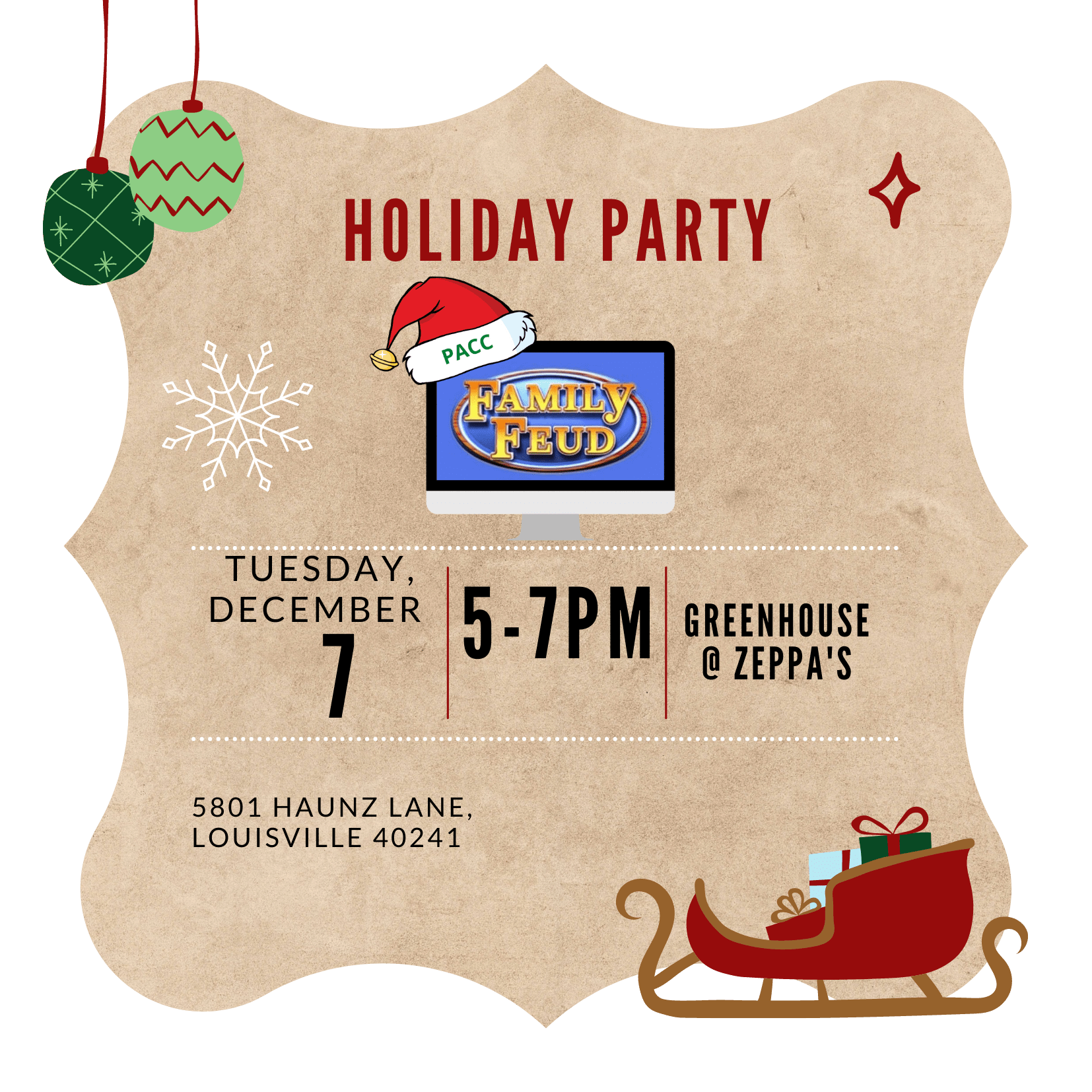 FREE - thanks to our generous sponsors! ‘TIS THE SEASON No matter what holiday you celebrate, we hope you'll join us for a fun filled networking event at The Greenhouse @ Zeppa's. The fun will be on Tuesday, December 7th from 5 pm - 7 pm. There will be food (Gustavo's Taco Bar) and also a Cash bar for adult beverages. Are you a game show enthusiast?? Form your own team of co-workers or friends for a friendly competition of FAMILY FEUD or we'll put you on a team - prizes will be awarded! Door prizes and more. THERE IS NO COST TO PLAY FAMILY FEUD - so don't be shy!