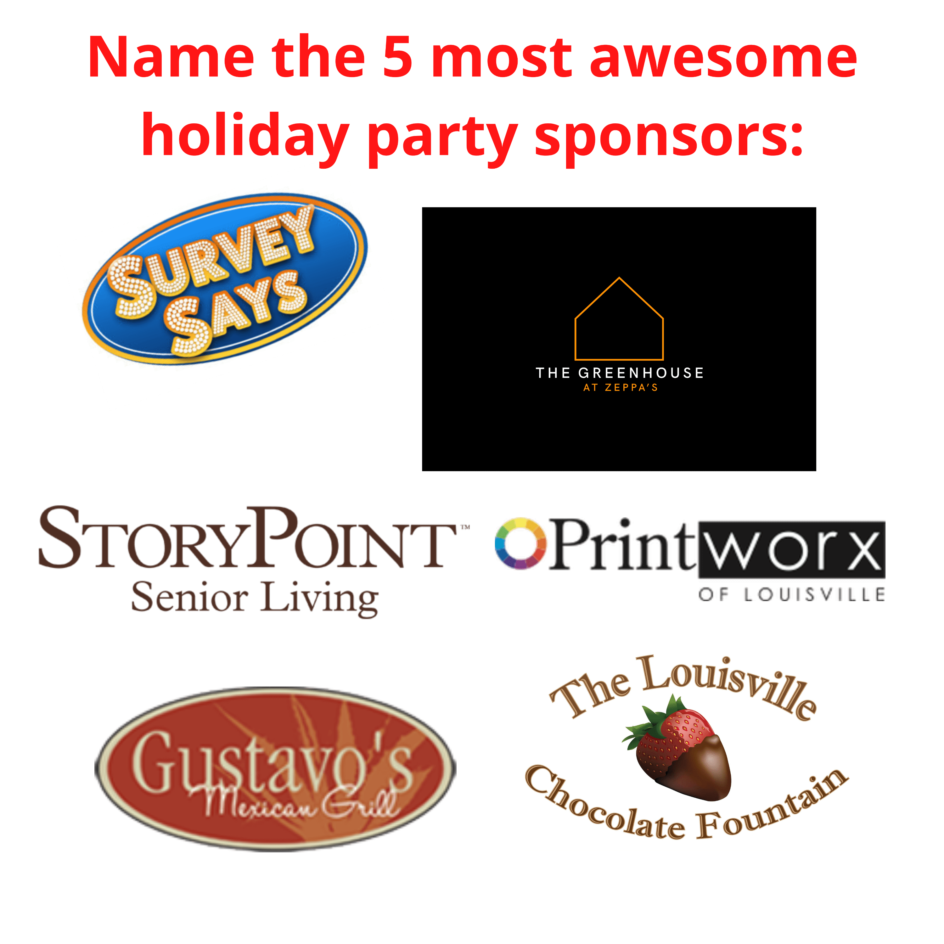 Thank you to our wonderful sponsors - The Greenhouse @ Zeppa's, Gustavo's, StoryPoint Prospect/Richwood Nursing & Rehab, PrintWorx of Louisville & The Louisville Chocolate Fountain!