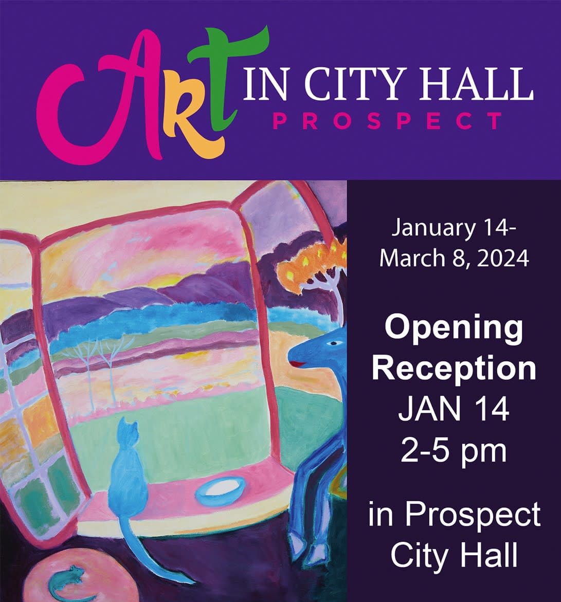 Prospect, announces the first of a series of art exhibitions in Prospect’s City Hall. The first Art in City Hall Prospect will open on January 14, 2024. Eleven artists presenting a variety of media and styles are participating. Dates: January 14 - March 8, 2024 Hours: Open January 14 and 15 from 2-5 pm and during weekly city hall hours.Images